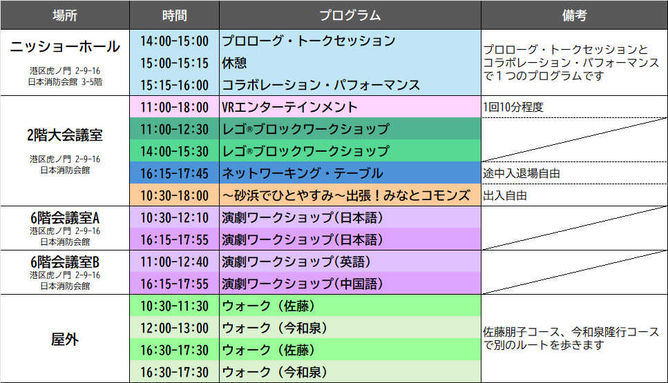 ~砂浜でひとやすみ~出張!みなとコモンズ | 砂浜をイメージした居場所「みなとコモンズ」をニッショーホールに設けます。子どもから大人まで、どなたでも立ち寄れるプレイスペースです。イベントの合間に休憩したり、見守りパフォーマーと一緒に遊んだり、自由に過ごせる居場所としてご利用いただけます。 時間:10時30分から18時まで ※出入自由 会場:2階大会議室 対象:どなたでも ※未就学児は保護者同伴の場合のみ利用可 言語:日本語 ※英語サポートあり |