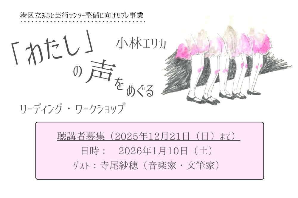 この度、港区立みなと芸術センター整備に向けたプレ事業として、作家・アーティスト小林エリカさんをお迎えして開催している『「わたし」の声をめぐるリーディング・ワークショップ』の聴講者を募集いたします。